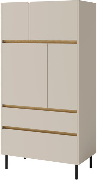 Ez a modern magas LUCA komód 165 centiméteres magassággal és magas fekete fém lábakkal rendelkezik. Az olajozott tölgy színű elemek kombinációja a homokszínnel igazán elegáns és lágy hatást keltenek. Ezekkel a semleges színekkel az ember sosem lőhet mellé. A komód az aljában két nagy fiókkal rendelkezik, amelyek fölött négy kis szekrény található polcokkal. A magas ko