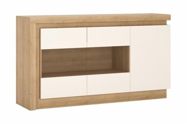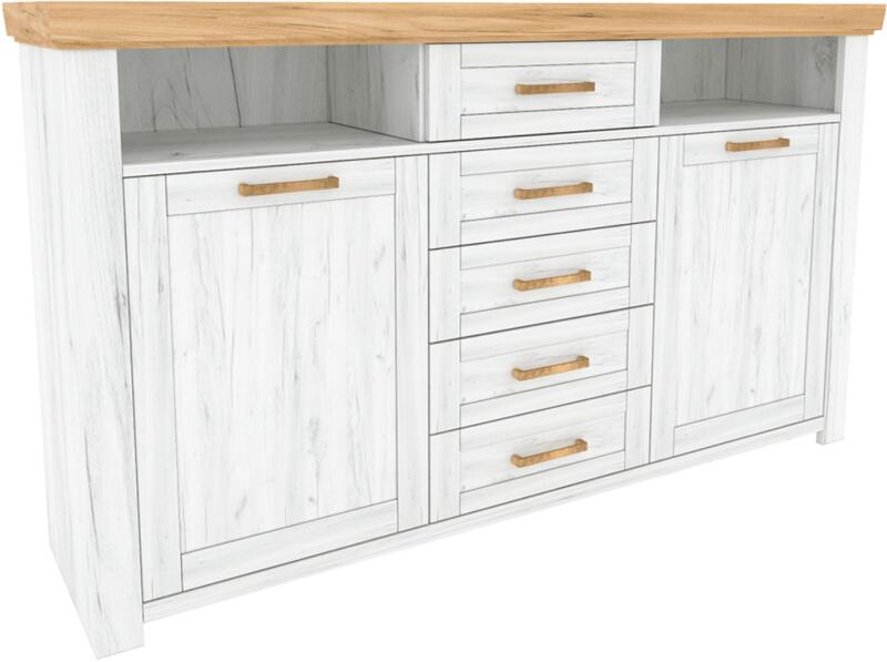 Komód E, tölgy craft arany/tölgy craft fehér, SUDBURY Nappali bútor > Komódok Anyag: DTD laminált/MDF Szín: tölgy craft arany/tölgy craft fehér Méretei (SzéxMéxMa): 167,9x41,8x96,7 cm Korpusz anyag vastagsága: 16 mm Felső lap anyag vastagsága: 22 mm Ajtók anyag vastagsága: 19 mm Alsó terület magassága a padlótól: 4,2 cm Öt fiók Két szekrény Nyitott rakodótér Bontá
