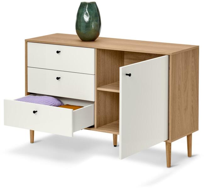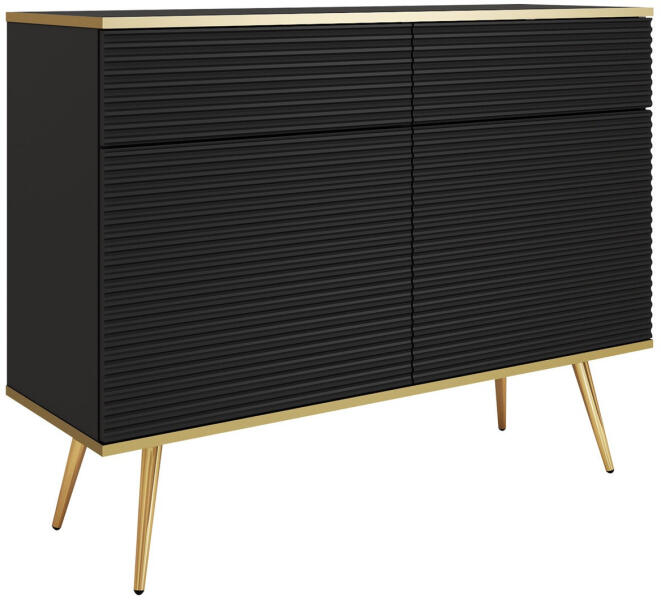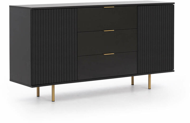Egy igazán külünleges és elegáns komódot keres? A fekete NUBIA széles komód a legigényesebb vásárlók elvárásainak is megfelel. Igazán elegáns és modern kinézettel rendelkezik. A komód számos tároló helyet kínál a három fióknak és a két ajtós szekrénynek köszönhetően. A komód tetejére pedig elhelyezheti a dísztárgyait, növényeit vagy a családi fényképeket.
