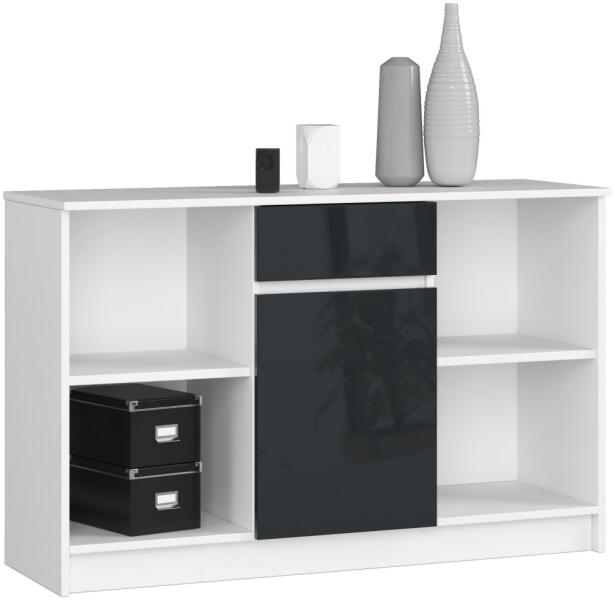 Modern, sokoldalú komód egy fiókkal és egy ajtóval, amely tökéletes tárolási megoldást kínál. A fehér korpusz és a magasfényű grafit frontok elegáns kontrasztot alkotnak, míg a 120 cm-es szélesség bőséges tárolóhelyet biztosít. Elegáns tárolás modern kivitelbenA B-17 komód egy modern tárolóbútor, amely ötvözi a funkcionalitást és a stílust. A fehér korpusz és