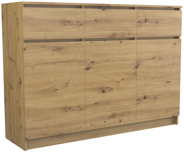 Modern, tágas komód 3 ajtóval és 3 fiókkal, fehér korpusszal és Sonoma tölgy frontokkal. Kiváló minőségű 16 mm-es laminált bútorlapból készült, ABS élzárással a tartósság érdekében. Elegáns tárolási megoldás modern otthonokbaEz a praktikus komód tökéletes egyensúlyt teremt a funkcionalitás és az esztétika között. A fehér korpusz és Sonoma tölgy frontok komb