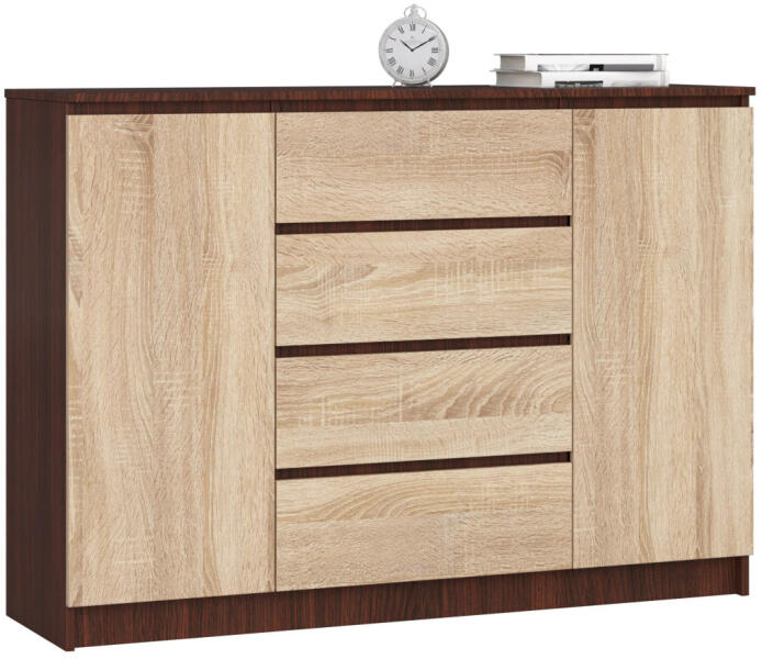Modern és sokoldalú komód 4 fiókkal és 2 ajtóval, amely tökéletes tárolási megoldást kínál. A wenge test és sonoma tölgy frontok elegáns kontrasztot alkotnak, míg a 16 mm-es laminált lap tartósságot biztosít. Elegáns tárolási megoldás modern otthonokbaEz a praktikus komód tökéletesen ötvözi a funkcionalitást és a stílust. A 138 cm széles bútor wenge színű korpu