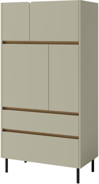 Ez a modern magas LUCA komód 165 centiméteres magassággal és magas fekete fém lábakkal rendelkezik. Az eukaliptusz tölgy és a baltic tölgy színű elemek kombinációja igazán elegáns és lágy hatást keltenek. Ezekkel a színek igazán jól kombinálhatók. A komód az aljában két nagy fiókkal rendelkezik, amelyek fölött négy kis szekrény található polcokkal. A magas komód m