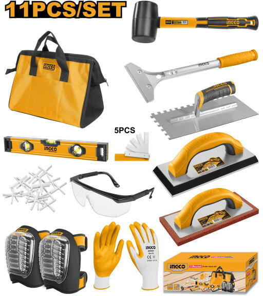 10 részes burkoló szett tartalma: 1 db gumi kalapács1 db festékkaparó, 5 db tartalék penge1 db 280 x 130 mm fogazott glettvas1 db 240 x 100 mm gumis fugázó1 db 230 x 100 mm finom gumis fugázó1 db 400 mm vízmérték1 db védőszemüveg1 db nitril mártott kesztyű1 db térdvédő250 db fugakereszt1 db nitril mártott kesztyű1 db 400 mm vászontáska Szállítá si terjedelem: Karton dob