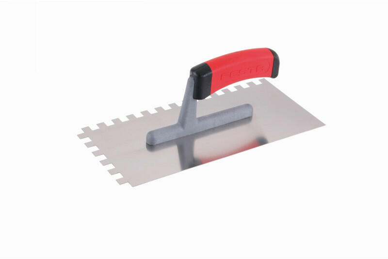 FESTA Glettvas 130 x 280 mm inox fogazott 10 x 10 mm lágy fogantyús Lemezvastagság 0,8 mmElsősorban csempék és burkolatok alá ragasztók felhordására, valamint esztrichek, stukkó, vakolatok, tömítőanyagok és egyéb építőanyagok felhordására használják. A rozsdamentes fogazott simító lehetővé teszi a ragasztó vagy építőanyag nyújtását csíkokban és a simító fogán