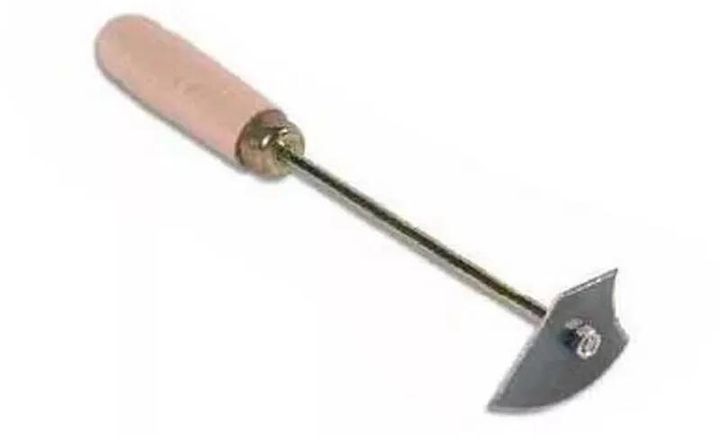 Ívelt, sokszögű pengés festékkaparó fa nyéllel.
