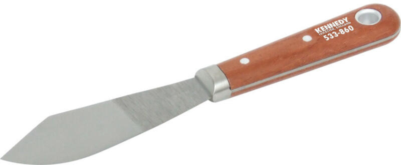 Nagy igénybevételre, átmenő szárral, megeresztett rugalmas acélpengével és polírozott rózsafa nyéllel. Hagyományos kialakítású üveges szerszám. Kés alakú heggyel. Penge: 115 x 38 mm