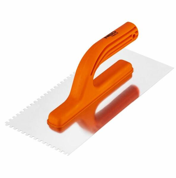 A NEO fogazott simító ragasztóhabarcsok felvitelére szolgál. Munkafelülete kiváló minőségű rozsdamentes acélból készül. A műanyagból készült ergonómikus markolat jól fekszik a tenyérben, növelve a munkavégzés kényelmét. A NEO márka a professzionális igény