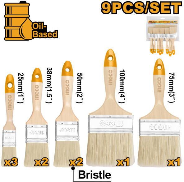 Olaj bázisú festékekhezMéretek:, 3 db 25 mm (1"), 2 db 38 mm (1.5"), 2 db 50 mm (2"), 1 db 75 mm (3"), 1 db 100 mm (4")Fa markolat Szállítási terjedelem: 9 db ecset, Bliszterben