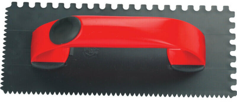 Minőségi fröccsöntött kontúros markolat. Nagyméretű talp két durva, és két finom fogazású éllel. Csempe- és szőnyegragasztók felhordásához. Méret: 270 x 110 mm