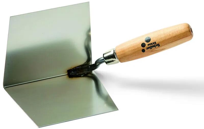 Rozsdamentes kőmüves sarokkanál (51102) egyenesvonalú belső szegletek kialakításához. Fa nyéllel, szárnyméret : 12 x 9,5 x 9,5 cm.