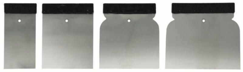4 részes japán spakli készlet 0.3 mm vékony rozsdamentes acéllemezzel és lapos műanyag fogantyúval. Kisebb repedések glettelésére, festékek és tapéták eltávolítására. Szélesség: 50, 80, 100 és 120 mm