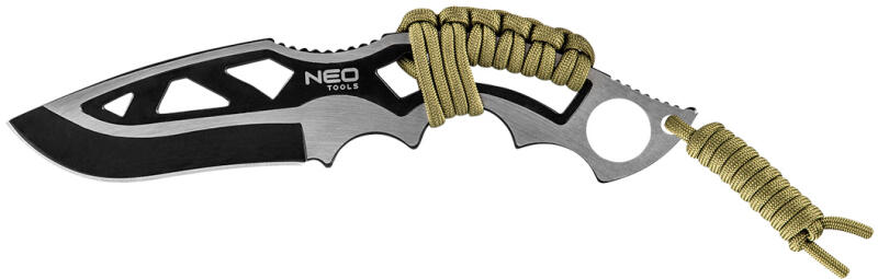 A NEO 63-100 fix pengéjű kés egy 430 rozsdamentes acélból készült, korlátozott példányszámú kés, melynek fix pengéje 11 cm hosszú és 3,3 mm vastag. Rendkívül tartós és többcélú. 75 cm-es paracord zsinórral a markolaton, amely nagy tartósságáról híres. A kést nejlon tokban kínálják. Nagyszerű kempingezéshez és túlélőutakhoz, de a műhelyben és a garázsban is