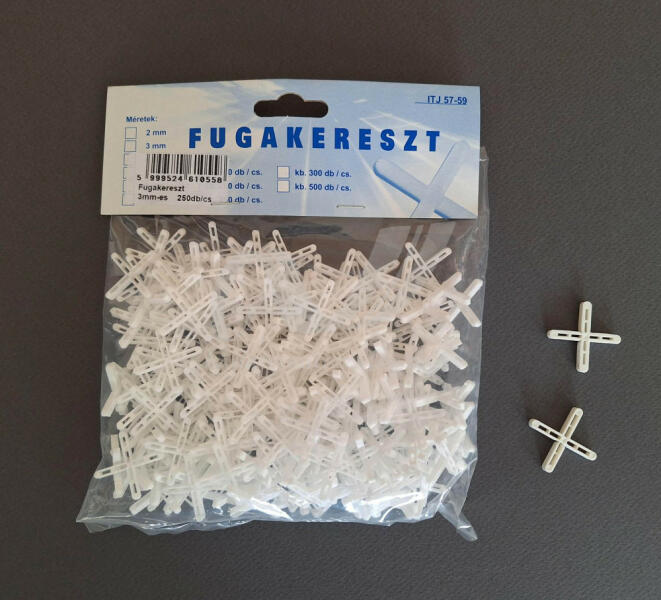 Fugakereszt 3 mm T-re törhető szárú 250 db/cs. kiszerelésben. Az egyik szárnál gyengítve, hogy könnyen fuga T-re törhető legyen.