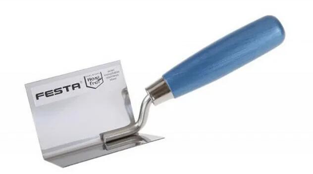 Rozsdamentes kőmüves sarokkanál egyenesvonalú belső szegletek kialakításához. Fa nyéllel, szárnyméret : 8 x 6 x 6 cm.