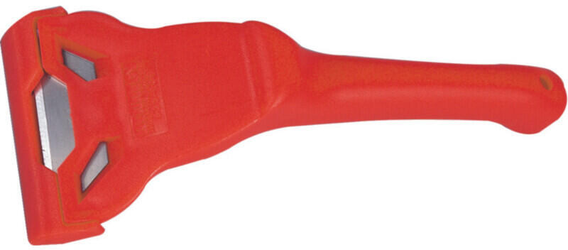 Polipropilén nyél edzett acél pengével és levehető műanyag fedéllel. Alkalmas festékfröccsenések üvegről való eltávolítására. Teljes hossz: 170 mm Súly: 55 g