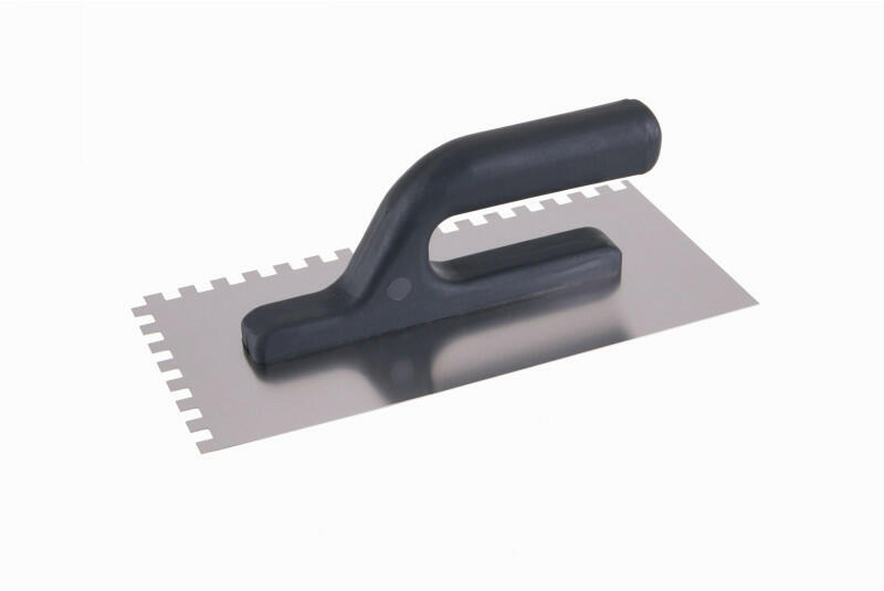 Glettvas 125 x 270 mm inox fogazott 8 x 8 mm műanyag nyéllel Fogazott glettvas 125 x 270 mm inox 8 x 8 mm műanyag nyéllel