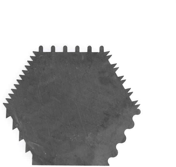 Fogazott acél spatulya 06 A Művészi fogazott acél spatulya kiváló segítő eszköz festők és szobrászok számára. A rugalmas spatulyával különböző effekteket készíthetünk akrilfestémyenken, olajfestményeken vagy szobrokon. A spatulya uyanúgy agyag és modellező masszák formázására alkalmas. A spatulya hatoldalú, mindegyik oldalán más fogazás található, ennek köszö