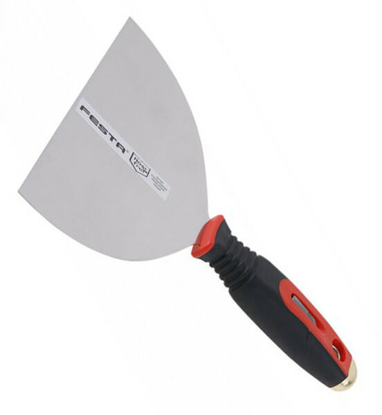 Saválló, rozsdamentes acél - lemezvastagság 0,7 mm - poliamid nyél, üvegszál hozzáadásával - ergonomikus, profilozott és gumirozott 2K foganytú (G-1) - glett, gipsz felhodásához - a kerekített sarkakkal megelőzhetőek a karcolások