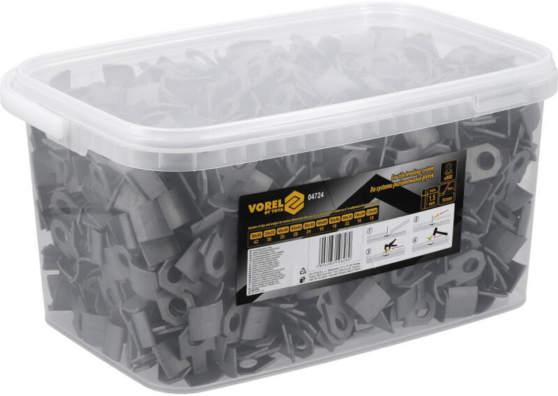Csempekiegyenlítő rendszer talpai, amelyek gyors és egyszerű csempét raknak le. A készlet 900 darab elszakadó talp áll. Segít megszüntetni a felületi egyenetlenségeket. Különböző méretű és vastagságú kerámia, porcelán kőagyag, rektifikált padló- és falcsempékhez tervezték, 7-14 mm tartományban. A rendszer a hagyományos kereszteket helyettesíti. Megakadályozza az el