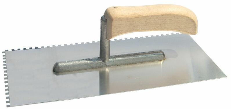 Négyszögletes fogazat a ragasztó elosztásához a kerámia lapokon (6X6 és 8X8), a parkettán (4x4), illetve a malter elosztásához (10X10 si 12X12) Rozsdamentes acél, fa fogantyú alumínium szárral az összeillesztéshez