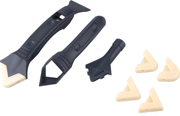 ""3 db ABS műanyag szerszám: fugalehúzó- és kaparó, fuga eltávolító, kenőfej+ 5 db szilikon lehúzóprofil R=3-6-10-13-17 mm ""
