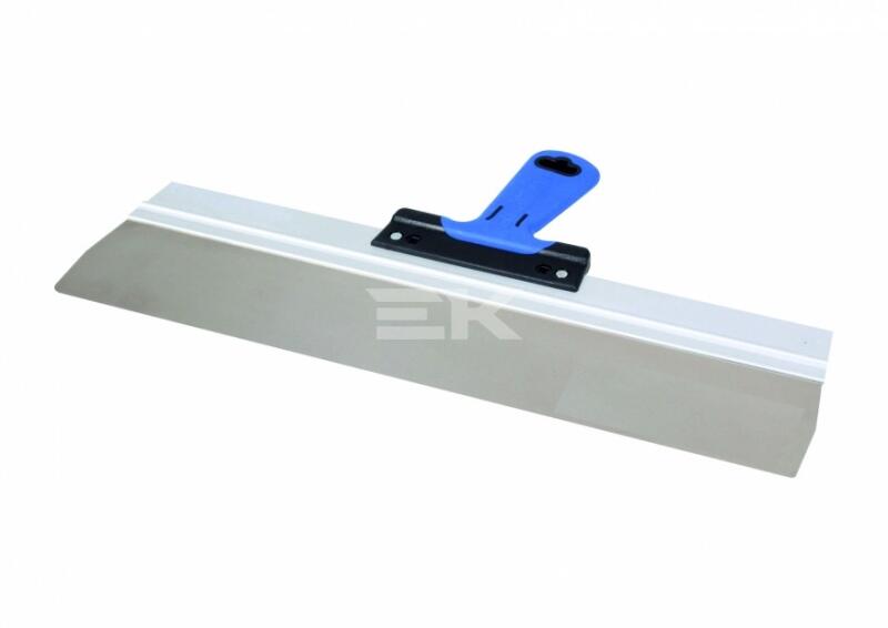 Építőipari befejező munkákhoz - rozsdamentes, saválló acél, vastagsága 0,4 mm - megerősített és tökéletesen egyenes munkaél, eloxált alumínium profilba ágyazásának köszönhetően - ergonomikus és profilozott 2K puha fogantyú - a lekerekített sarkok nem karcolják a felületet