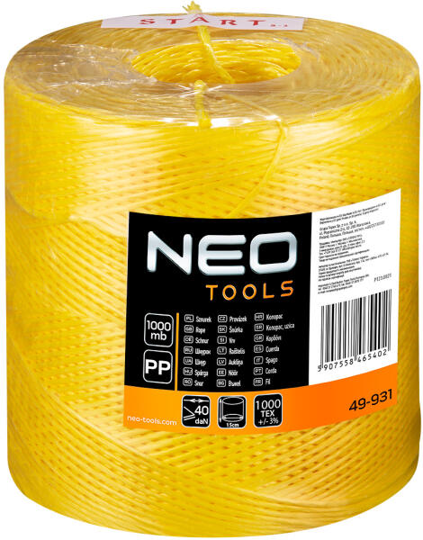 A NEO 1000 m hosszú polipropilén zsinór (cikkszám: 49-931) 1000 m hosszú az ásványgyapot rögzítéséhez. A zsinór erős, fonott és szakadásálló (szakítóerő legalább 40 daN).