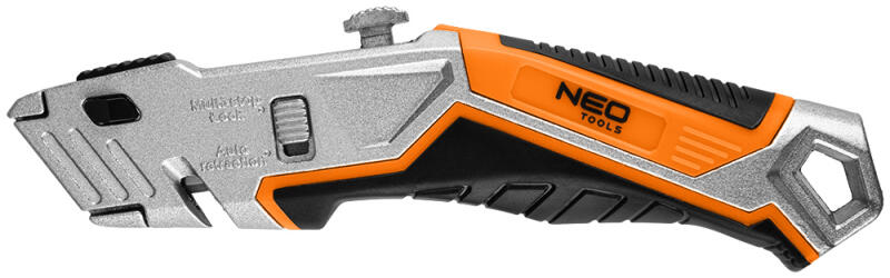 A NEO TOOLS 1+5 pengés összecsukható, trapézpengés kés 6 pengével van felszerelve. Jellemzője a fix penge és a biztonsági penge funkciója (kihúzható és automatikus). A könnyű alumínium testnek köszönhetően a súlya nagyon alacsony. A NEO TOOLS kés zsinór- és övvágó funkcióval rendelkezik. A testbe épített tartalék pengék tárolójának köszönhetően felkészült a