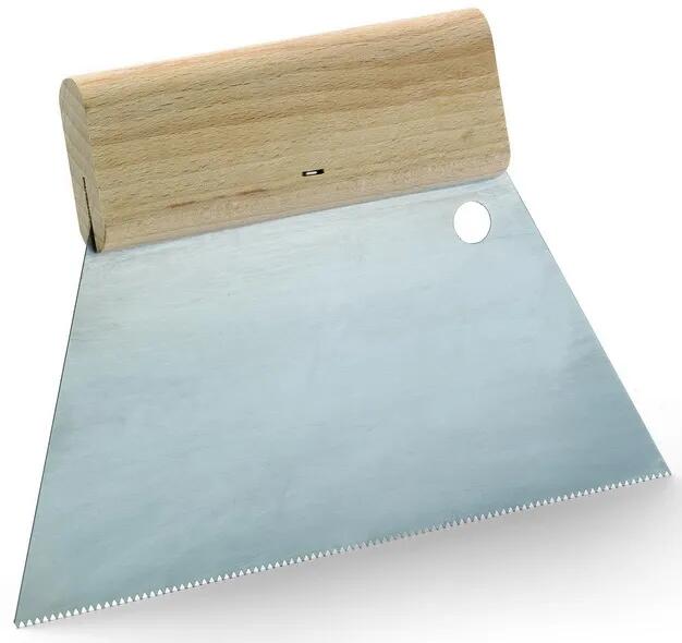 Fogazott kenőspatulya, 18 cm, széles, A3 fogazattal. Fogazás méretei fogszélesség: 0,4 mm, foghíjak: 1,6 mm, metszésmélység: 1,5 mm