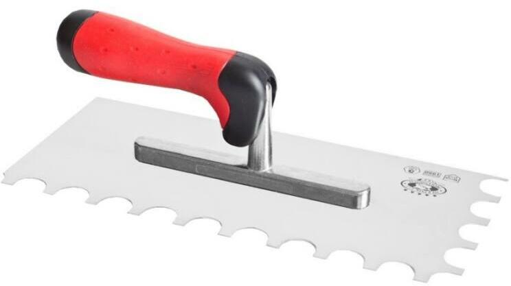 glettelőkanál 13×27cm rozsdamentes csempéző 10×10mm, SOFT gumi nyél Kiváló rozsdamentes (inox) acélból készült lap. Puha gumi borítású fogóval rendelkezik, ami a folyamatos munkánál nagy előnyt jelent. Falfelületek, járófelületek lapokkal való burkolásakor csempéző glettvasat használjunk.