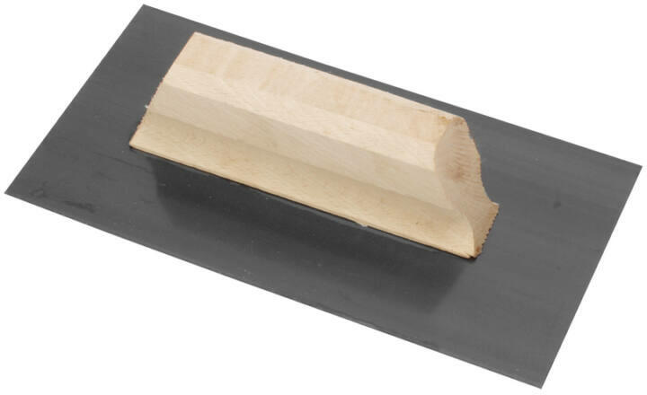 Biztos fogást biztosító, csiszolt, natúr keményfa markolat 2 csavarral alulról rögzített 0,5mm vastag rozsdamentes acél glettvas