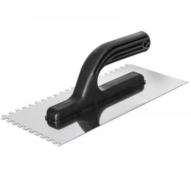A ragasztóhabarcs gyors és helyes felhordásához fogazott simító. A simító rozsdamentes acélból készült, ami korrózióállóvá és könnyen tisztíthatóvá teszi a munka után. Jól formázott műanyag fogantyú. Fogvastagság 6 mm. Tulajdonságok: Konstrukció anyaga-rozsdamentes acél Lakkozotttermék Technikaiadatok: S i m í t ó m é r e t e k : 270x130 mm A fogak vastagsága -