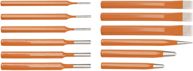 A NEO 33-062 vágó és kiütő készlet egy összeállítás 12 különböző eszközből, amelyek közé tartozik 6 darab kiütő, 3 darab lapos vágó, 1 darab kúpos csapszegkiütő és 2 darab pontozó. Mindegyik eszköz kiváló minőségű, és hosszú élettartamot biztosító króm-vanádium acélból készült. Az eszközöket praktikus, a tárolást és a szállítást megkönnyítő m
