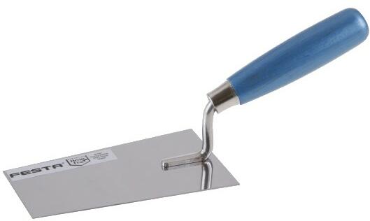 Trapéz alakú, rozsdamentes acélból készült kőműves simító kanál, fa nyéllel.