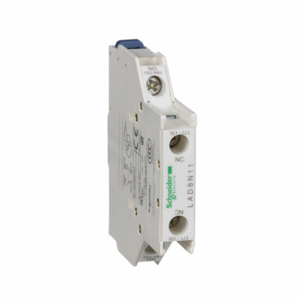 LAD-8N11 Segédérintkező blokk, oldalsó, 1Z+1NY, csavaros csatlakozás Schneider TeSys D pillanatkioldású segédérintkező-blokk, LC. D mágneskapcsolókhoz és CAD vezérlőrelékhez, csak AC tekercsekkel. 10 A-ig skálázható NC + 1 NC érintkezőket biztosít (NC tükör minősítéssel) 690 V AC feszültségig, csavaros szorítókengyeles csatlakozással. Oldalsó rögzítéssel magas m