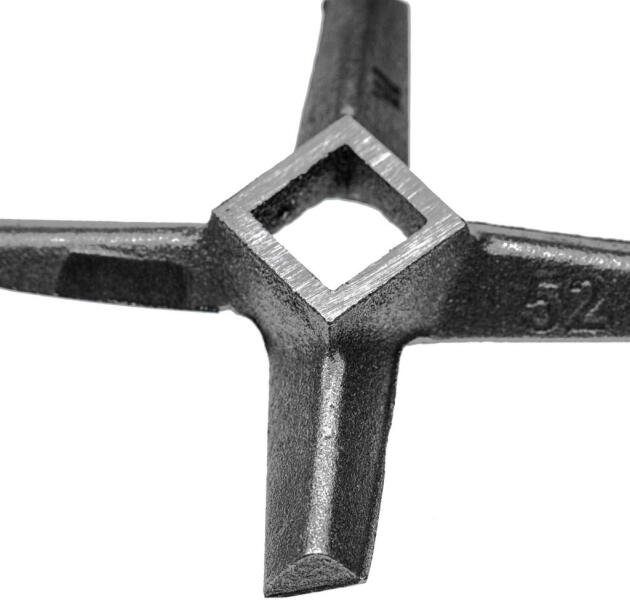 Robusztus húsdaráló keresztpenge (52-es méretű) öntöttvasból az ételaprítóhoz. Teljes funkcionalitás és kompatibilitás pl. ADE, Caso, KBS aprítógépével. Jó felépítésű az egyszerű csere érdekében. Kopásálló anyagokból készült és kiváló vágási eredményeket ér el. Ha egy kompatibilis és költséghatékony késblokkot keres, jó helyen jár. A keresztpenge közv