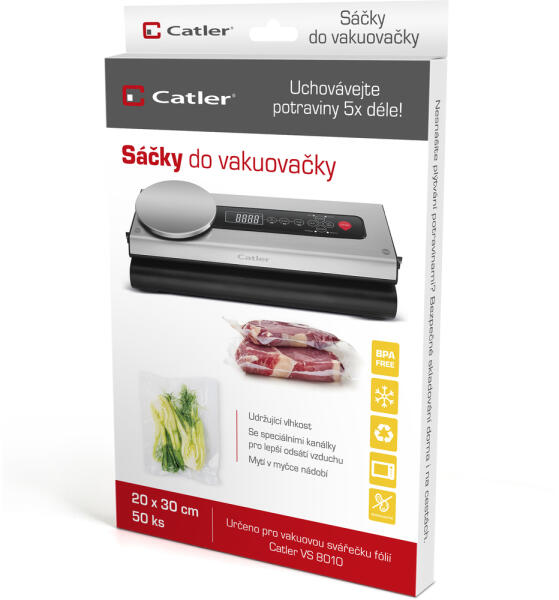 VÁKUUMFÓLIA TASAK BPA mentes Speciális csatornákkal a jobb légelszívás érdekében Alkalmas a Catler VS 8010 vákuumozóhoz A csomag 50 tasakot tartalmaz, mérete: 20 x 30 cm/db