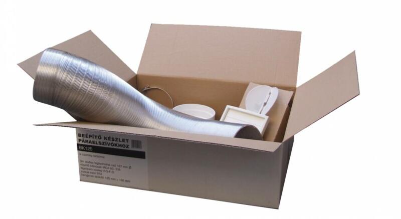 3 méter 127 mm átmérőjű többrétegű aluflex légtechnikai cső, 1 db zsalus rács, 2 db rögzítő bilincs, hengeres szűkítő (125/100 mm) 125 mm-es csőátmérővel rendelkező páraelszívók kivezetéséhez.