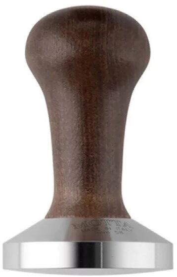 Rozsdamentes acél talppal és ergonomikus fa fogantyúval ellátott kávépamacs.