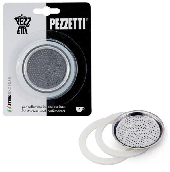 Pezzetti 4 személyes acél/indukciós kávéfőzőhöz 2 db szilikon gumigyűrű + felső szűró Külső átmérő: 65 mm Belső átmérő: 55 mm Vastagság: 3 mm Szűrő átmérő: 58 mm