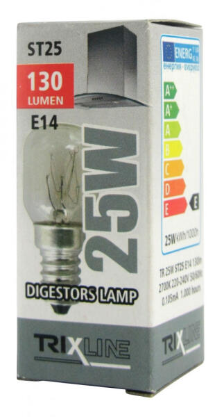 A Trixline ST25 25W E14 Páraelszívó izzó speciálisan kialakított izzó a konyhai páraelszívókhoz. Az E14 foglalatnak köszönhetően könnyen cserélhető a régi izzók helyett. A teljesítménye 25 W , és a fényárama elegendő ahhoz, hogy világítást biztosítson a páraelszívó alatt, de nem annyira erős, hogy zavarja a konyhai munkát. Az ST25 izzó mérete ST25x54mm, így a ko