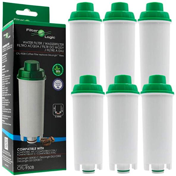 6 db-os csomag vízszűrő betét DeLonghi kávéfőzőjéhez! A FilterLogic CFL950B vízszűrő ugyanolyan jó szűrést biztosít, mint a gyári DeLonghi vízszűrő betét! FilterLogic CFL-950B - utángyártott DeLonghi DLSC002 kávéfőzőgép vízszűrő, vízlágyító filter patron, vízlágyító patron, kávéfőző vízszűrő Az alábbi DeLonghi kávéfőző vízlágyító vízszűrők
