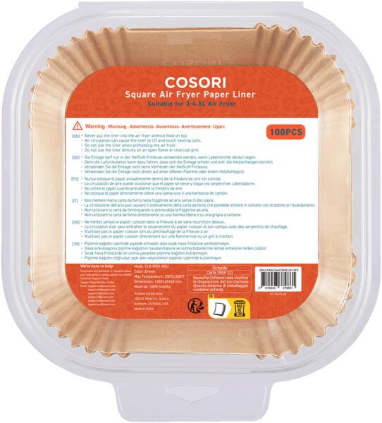 Eredeti Cosori papírtányér forrólevegős sütőhöz 100db-os kiszerelés 16,5cm széles hasznos alapterület Kompatibilis 3 - 4,5 literes kosárméretekkel Kompatibi lis: Dual Basket, Pro, Premium, Smart, Lite, Lite Mini