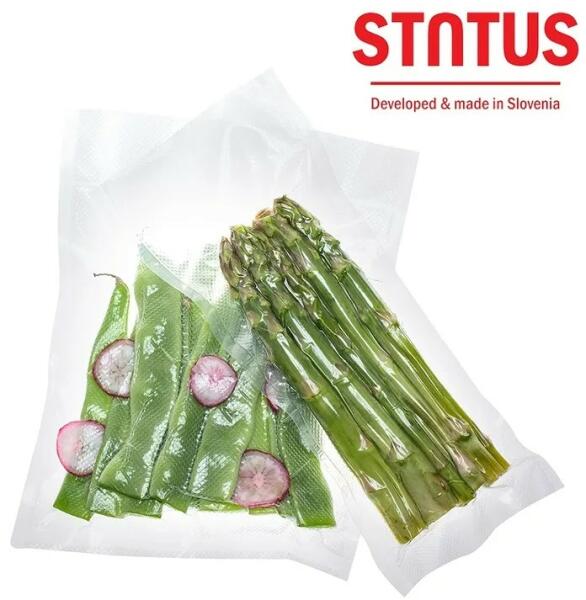 VÁKUUMTASAKOK A 20 × 28 cm-es univerzális vákuumzacskók kiválóan alkalmasak készétel adagok vákuumozására, amelyek akár egy hétig is elállnak a vákuumban. A szlovéniai családi vállalkozásban gyártott STATUS