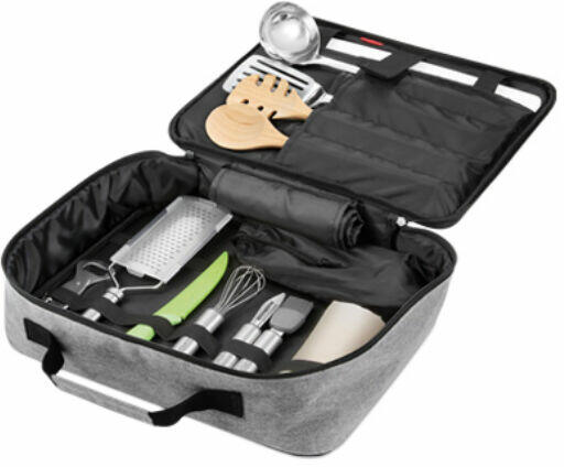 Kiváló a konyhai eszközök biztonságos szállításához az utazás során. Az edények és az eszközök áttekinthetően vannak elhelyezve a tárolóban, védve a sérülésektől. Kiváló minőségű cipzáras záródással, serpenyős zsebbel, evőeszköz tokkal és fém akasztókkal, a főzés során történő felakasztáshoz. Ellenálló poliészter textíliából készült. 3 év gara