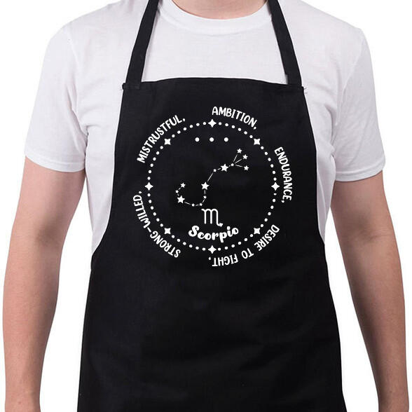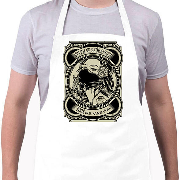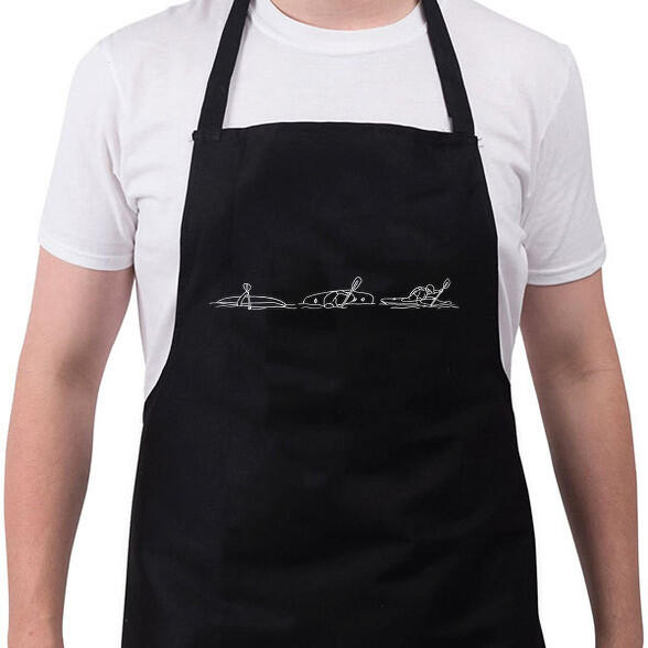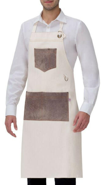 Stílusos szakács nyakkötény, kivételes a nyakon a sárgaréz lyukon keresztül állítható pánt, a praktikus a törlőkendő számára és a zsebeken található több szegecsnek köszönhetően.