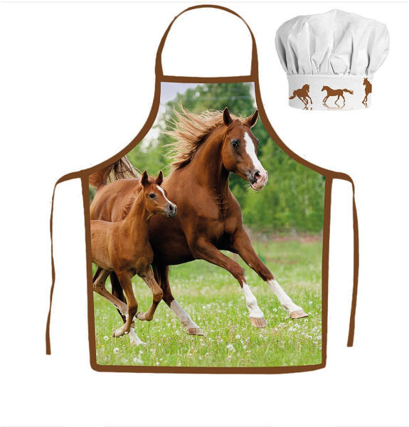 Horse, Lovas gyerek kötény 2 darabos szett Anyaga: 100% poliészter Szett tartalma: - 1 db kötény - 1 db kuktasapka Ajánlott 3-8 éves korig.