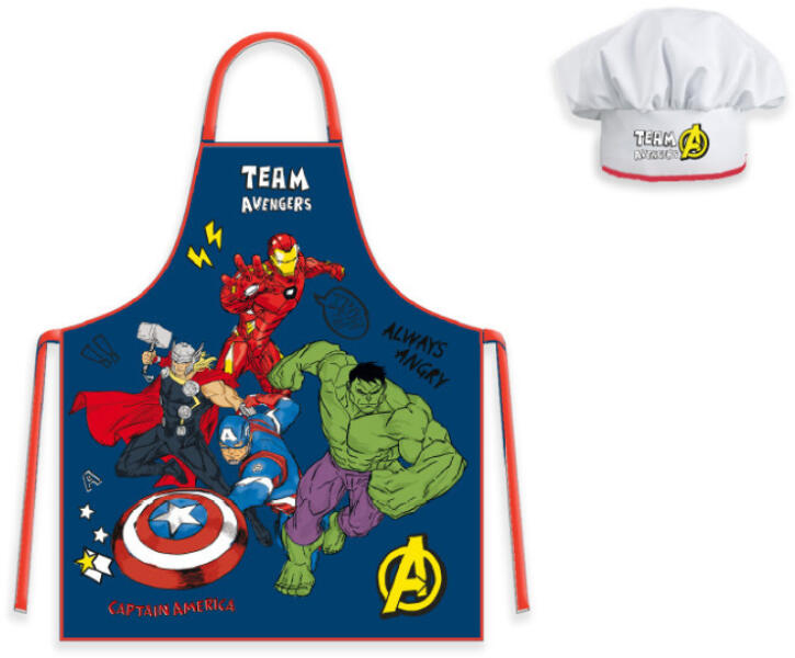 Avengers, Bosszúállók gyerek kötény szett Anyaga: 100% poliészter Szett tartalma: - 1 db kötény - 1 db kuktasapka Ajánlott 3-8 éves korig. Csomagolt termék, ajándéknak is kitűnő.