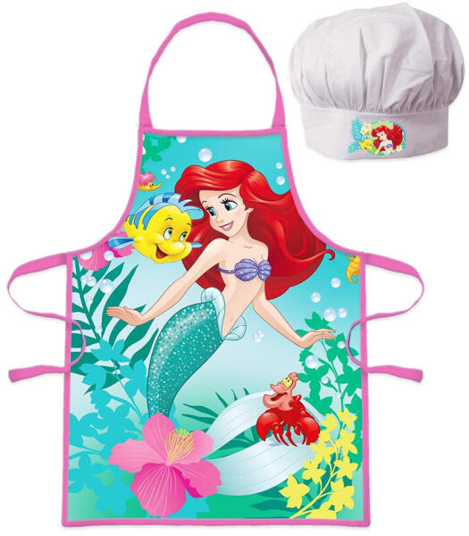 Disney Princess, Disney Hercegnők, Ariel Gyerek kötény 2 darabos szett Anyaga: 100% poliészter Szett tartalma: - 1 db kötény - 1 db kuktasapka Ajánlott 3-8 éves korig. Csomagolt termék, ajándéknak is kitűnő.